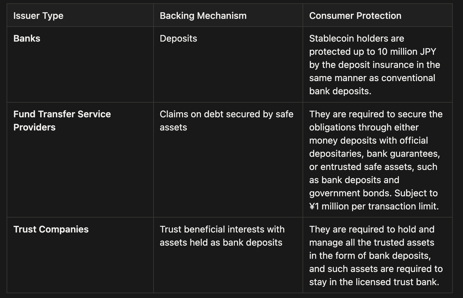 根据日本法律,稳定币被归类为“电子支付手段”(EPI),即以法定货币计价并可按面值赎回的数字资产。该框架区分了两种类型:
