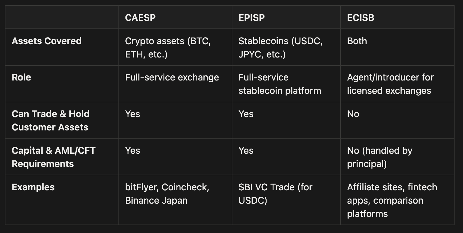 拥有 CAESP(加密资产交换业务)牌照并希望交易稳定币的实体,还需要向金融厅申请单独的 EPISP 牌照。这意味着加密交易所必须获得双重注册(CAESP + EPISP)才能同时提供加密资产和稳定币。例如,日本 SBI 控股旗下的加密货币交易所子公司 SBI VC Trade 成为首家获得 EPISP 牌照的日本公司。处理 Circle 的 USDC 等离岸稳定币需要该牌照。