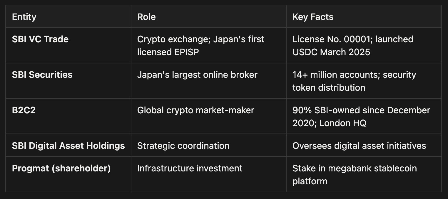 SBI 的数字资产战略跨越多个子公司,每个子公司在稳定币价值链中发挥不同的功能: