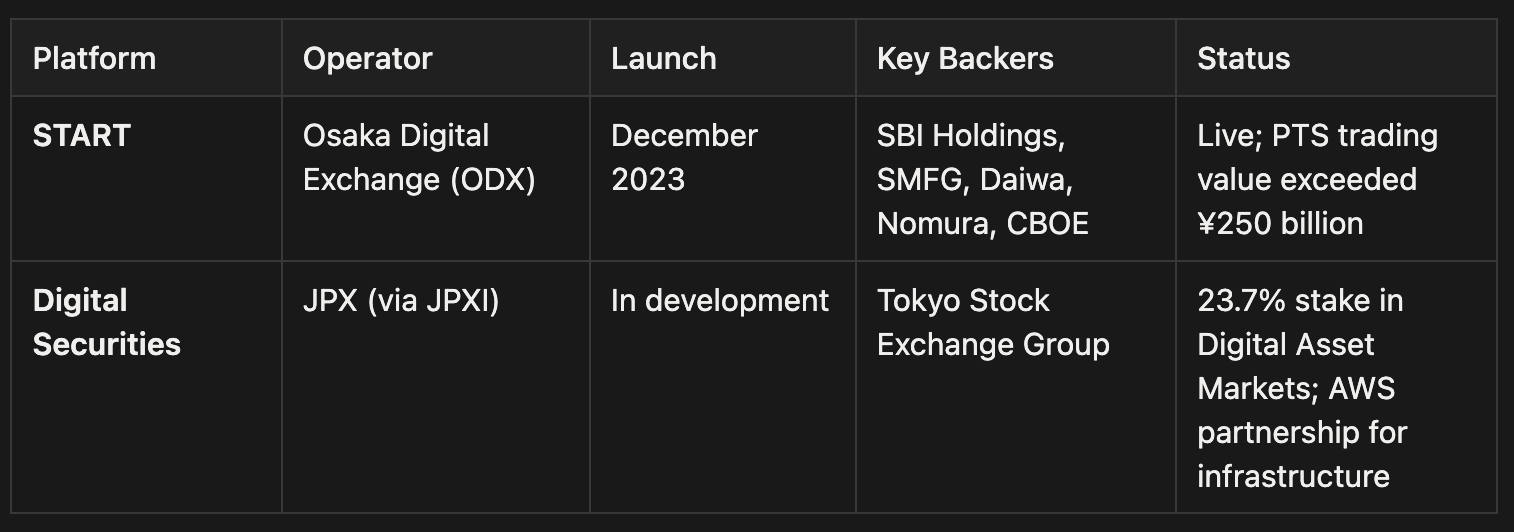 日本交易所集团(JPX)作为东京证券交易所的运营者,也通过其子公司 JPX Market Innovation & Research (JPXI) 将数字证券定位为增长领域。JPX 持有 Digital Asset Markets (DAM) 23.7% 的股份,后者是 Zipangcoin(三井物产发行的黄金支持代币)的独家分销商。其 2027 年中期经营计划将数字资产基础设施列为收入多元化的重点。