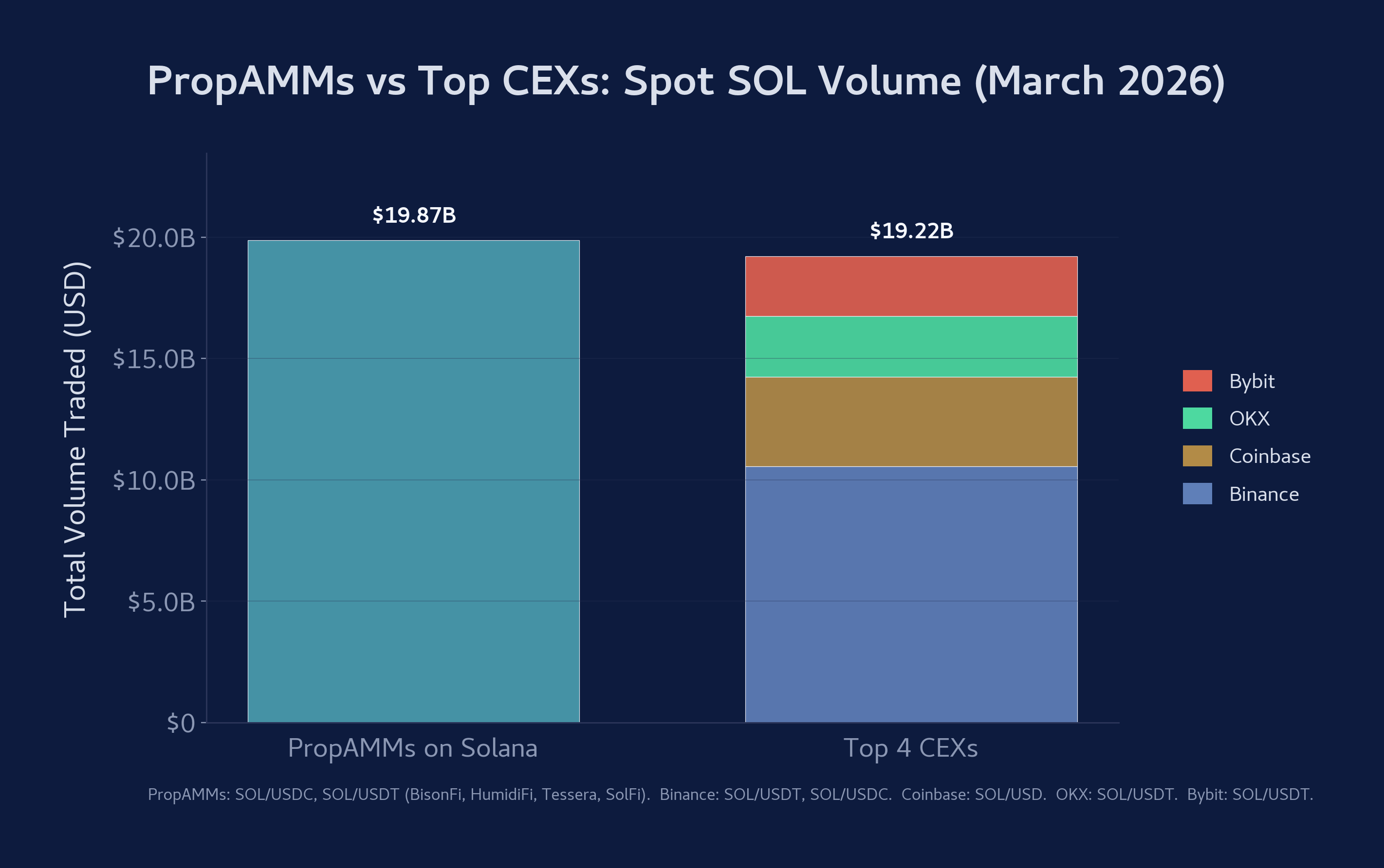 这并非 SOL 现货市场的某个利基细分领域。3 月份 Solana 顶级 PropAMM 阵营的链上交易量总计为 181.9 亿美元的 SOL/USDC 和 16.8 亿美元的 SOL/USDT,这两个交易对的总和为 198.7 亿美元。