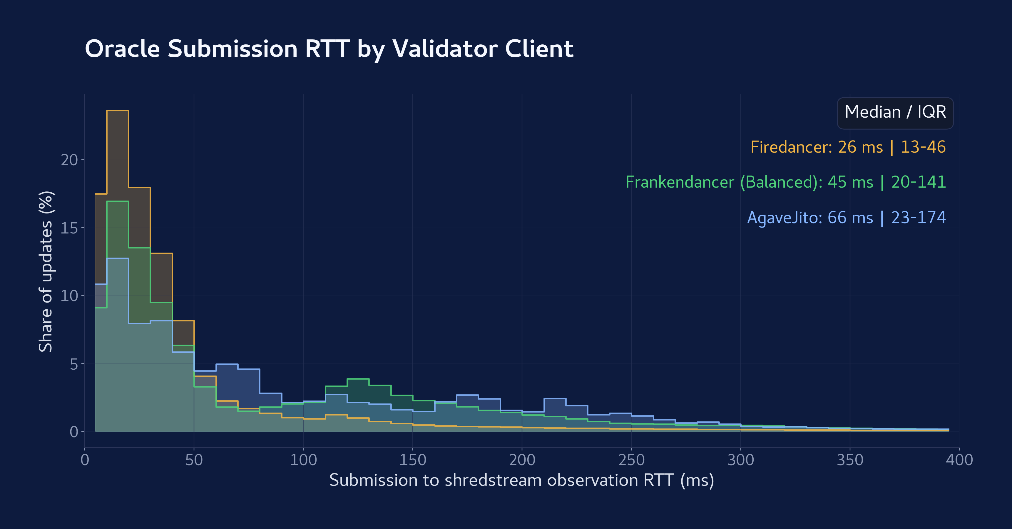 对于像 SOL/USDC 这样竞争激烈的市场,运营商需要快速的包含信号来确认更新已进入当前区块。在 Solana 上,Leader 在大约 400 毫秒的窗口内持续构建区块,通过名为 Turbine 的协议在该窗口内流式传输被称为 Shred 的交易集。由于 Shred 在区块完成之前就已经传播,根据 Leader 的客户端软件和区块打包逻辑,从预言机提交到观察到包含的往返时间可能短至几毫秒。
