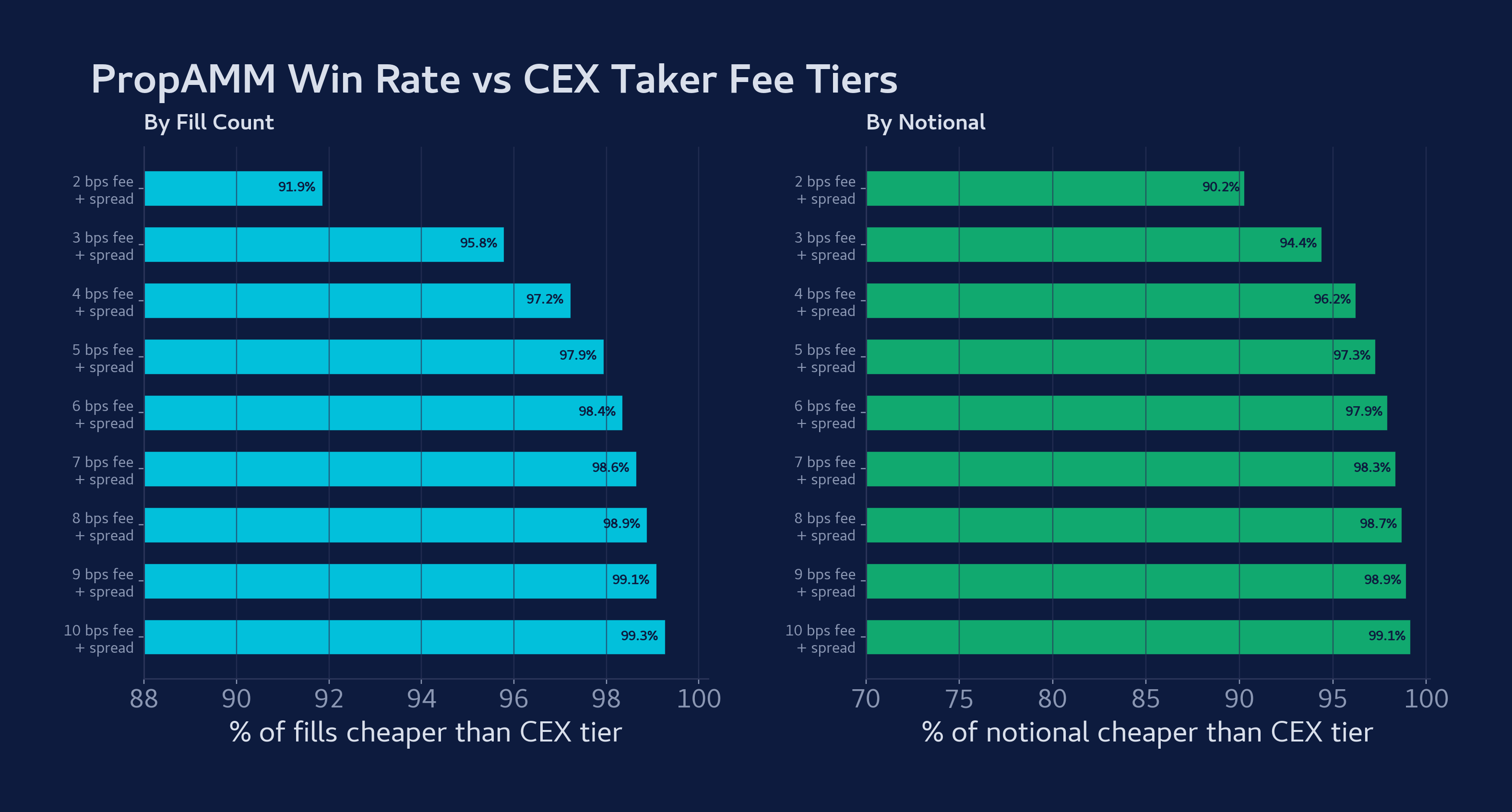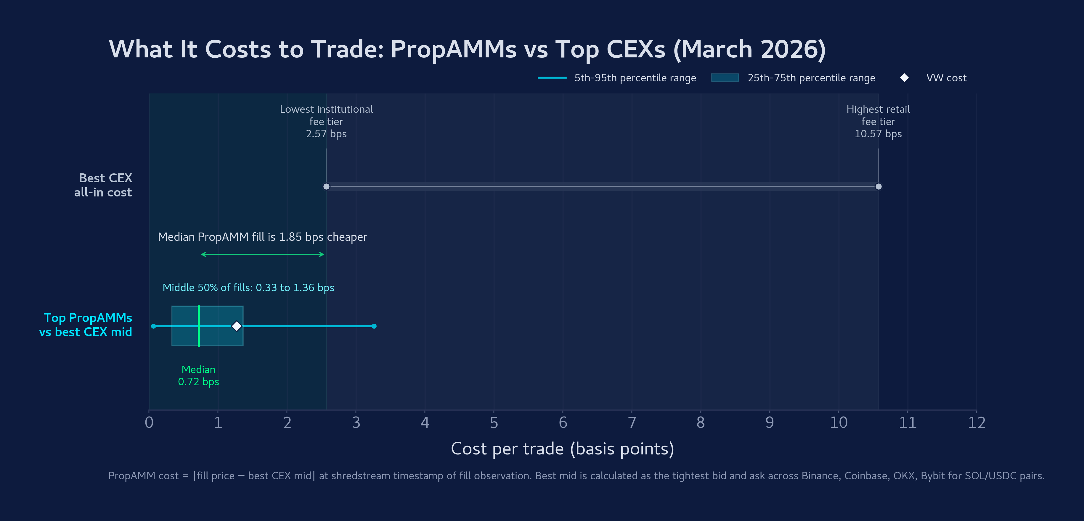 在中心化交易所中,Taker 被要求在每次成交时支付点差加交易所费用。在可获得的最优惠等级(通常需要每月数十亿交易量才能达标)下,全包成本为 2.57 bps。以此为标准,91.9% 的 PropAMM 成交和 90.2% 的总名义价值对终端用户来说更便宜。在最低的零售等级下,全包成本超过 10 bps,而 99.3% 的 PropAMM 成交优于该水平。