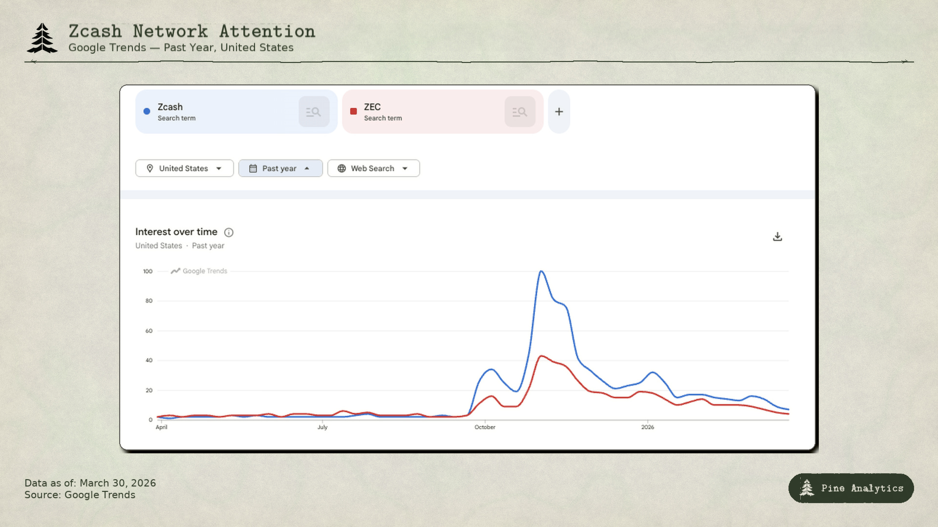 从 Google 搜索趋势以及其他代表网络外部关注度的指标来看,本季度延续了网络在 2025 年第四季度价格暴涨期间所获得的巨大关注度回落的过程。