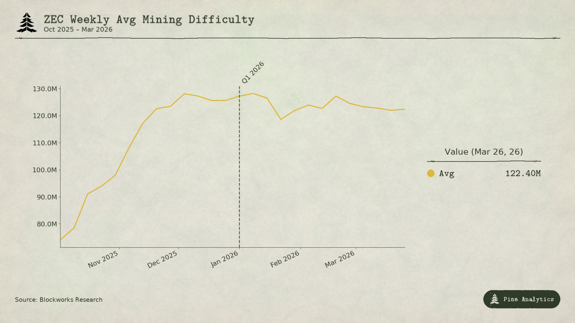 在 2025 年第四季度,Zcash 的 hashrate 增加了约 75%,而第一季度则从那段强劲增长中略有降温。观察每天在网络上赢得区块的 mining pool 数量,这一数字已从季度初的约 12 个上升到目前的 14-16 个。2025 年 7 月时,只有 7 个 pool 在赢得区块,因此矿工多样性大约翻了一倍。鉴于本季度挖矿难度相较于 ZEC 价格更为坚挺,且 pool 多样性继续增加,这种温和的 hashrate 降温实际上反映的是对网络基础设施长期承诺的增强,而不是矿工撤离。