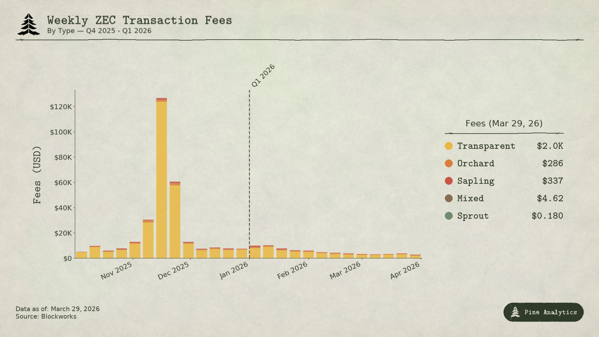 本节中的指标衡量的是 Zcash 网络的外部需求侧:有多少价值在链上流动,用户为转移这些价值支付了多少费用,以及网络从现有持有者群体之外吸引了多少关注。上面的 shielded pool 部分衡量的是当前参与者的投入深度,而这些指标则捕捉活动的广度,以及新的使用是否正在流入网络。在第一季度,所有需求指标的大体模式都是从第四季度高点逐步回落,这主要由 ZEC 价格下跌解释,而不是原生 Token 计价活动出现了实质性减少。网络比三个月前更安静,但以 ZEC 计量的基础使用情况比美元计价数据所显示的要更稳健。