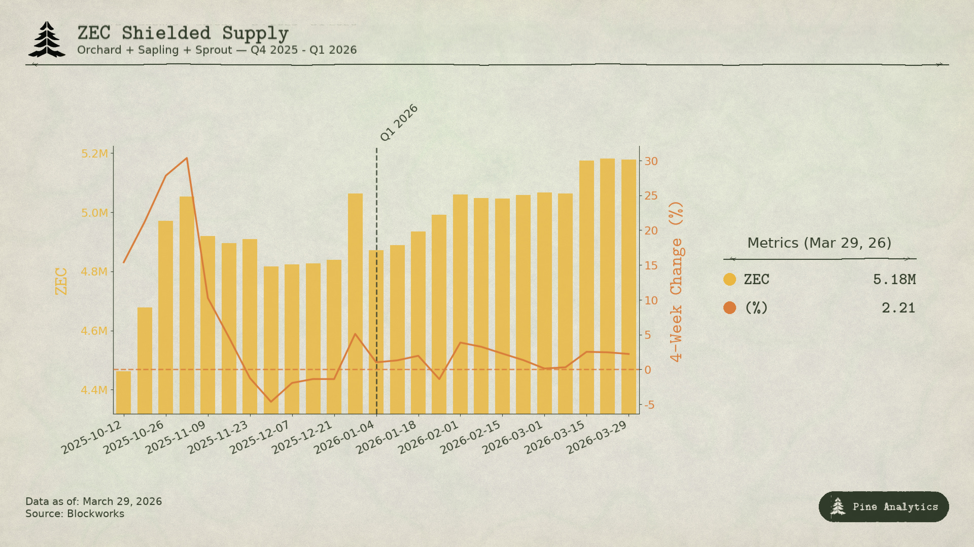 在 2026 年第一季度,shielded pool 中的 ZEC 数量增长了约 5.9%,按净额计算,这相当于约 28.8 万枚新增 ZEC 存入这些 pool。该增长量大约比本季度通过挖矿新增发行的 ZEC 数量高出 76%,表明 shielded pool 的流入超过了新增 Token 发行,不过其增长速度相较于上季度 shielded pool 供应的剧烈扩张有所放缓。按 pool 拆分来看,Orchard pool 在本季度增长了近 30 万 ZEC,而 Sapling pool 下降了约 1.2 万 ZEC,Sprout pool 则下降了大约 50 ZEC。就 shielded ZEC 的整体构成而言,本季度是上季度 pool 增长的较慢延续,同时继续向 Orchard 集中,使其成为主导性的 shielded pool。