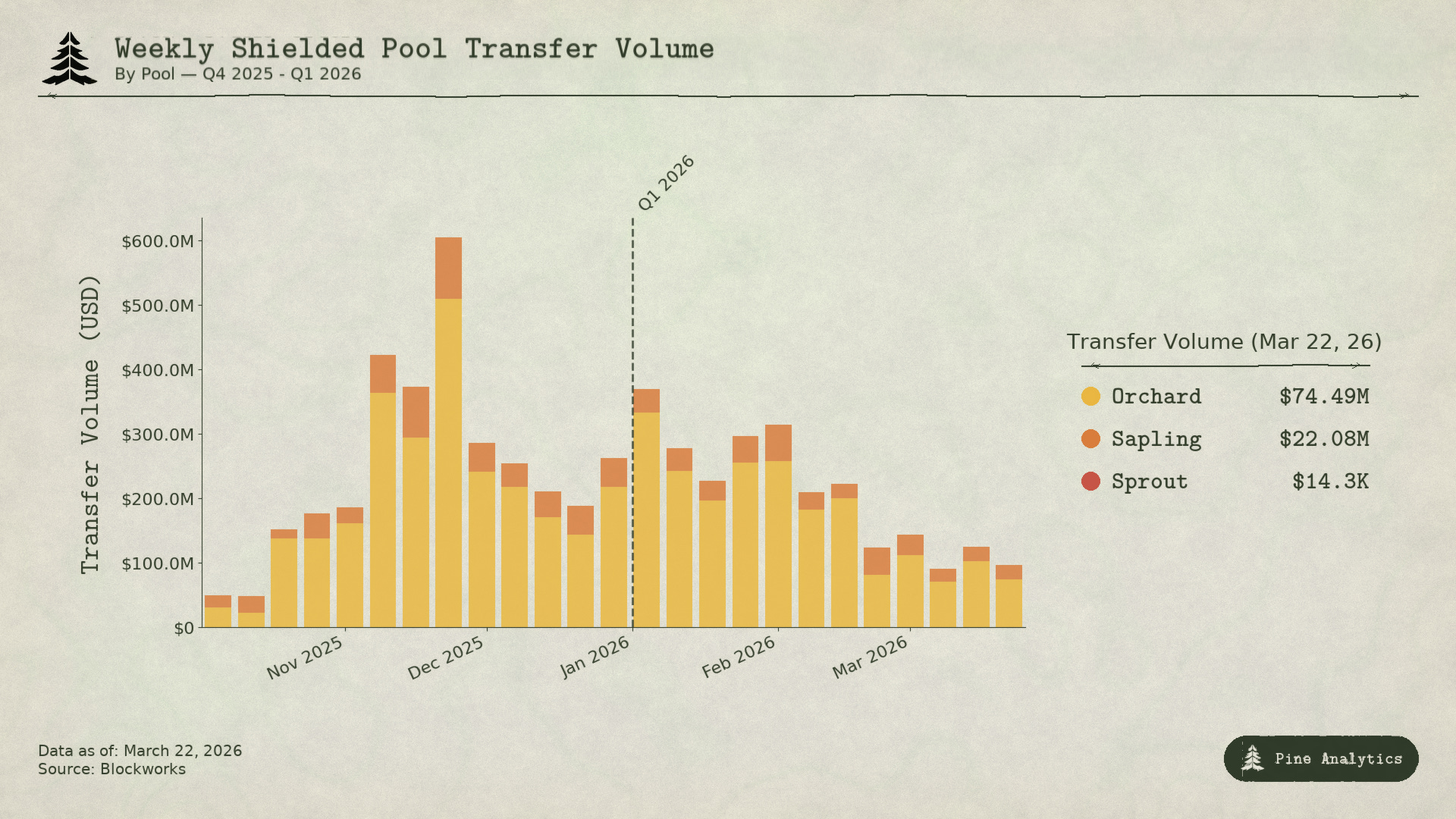 最关键的例外是 shielded pool 的增长。持有在 shielded pool 中的 ZEC 数量在整个第一季度持续上升,净流入量大约比新增发行量高出 76%。这意味着增长是由现有持有者将透明余额迁移到 shielded pool 推动的,而不仅仅是区块奖励的累积。Orchard 吸收了几乎全部增量,增加了大约 30 万 ZEC,而 Sapling 和 Sprout 则继续下降。对于一个其价值主张建立在私密价值存储之上的网络来说,在一个较为平静的市场时期仍然持续采用 shielded,是本报告中最重要的信号。