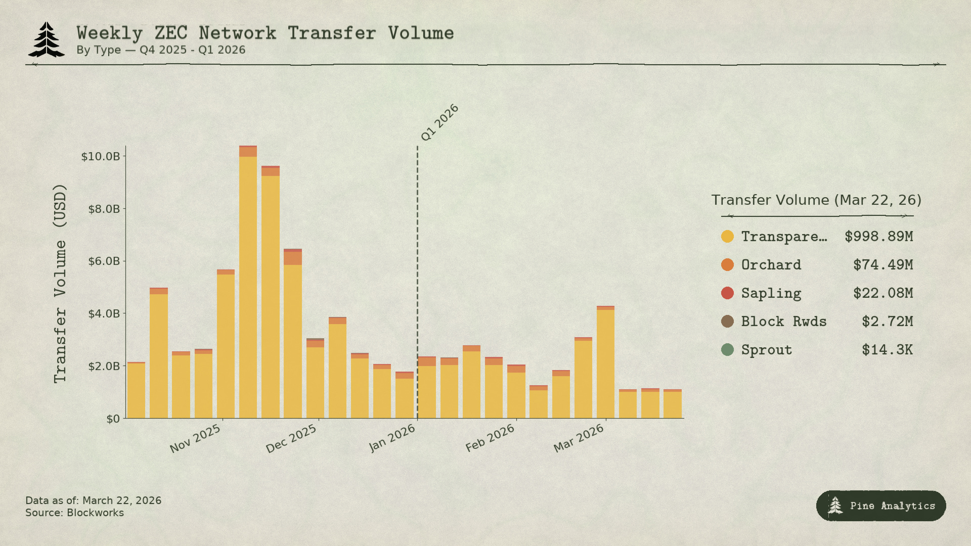 今年第一季度,Zcash 网络上的总 transfer volume 整体呈下降趋势,并在 2 月底出现一次尖峰。这一下降几乎完全是由 ZEC 价格下跌导致的,因为以 ZEC 计价的 transfer volume 与 2025 年第四季度末相比是相近的。