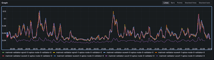 图 4:8 个不同 validator 节点的平均区块执行时间(单位:秒)。mainnet-validator-usce1–0-aptos-node-validator-0 节点启用了 Loader V2(底部曲线)。其他节点使用传统 loader。