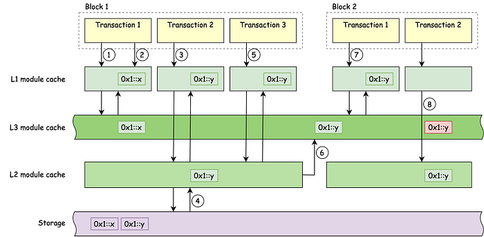 图 3:Loader V2 架构,以及它如何融入 Move VM 和 Block-STM 执行。最初,L3 包含 module 0x1::x 。在区块 1 中:(1) 第一个交易从 L3 cache 读取 0x1::x ,并将其记录到本地 L1 cache;(2) 第一个交易再次读取 0x1::x ,这次来自 L1 cache;(3) 第二个交易读取 0x1::y ,它在 L3 cache 和 L2 cache 中都未命中;(4) 该 module 从 storage 中取出并缓存到 L2 cache;(5) 第三个交易从 L2 cache 读取 module 0x1::y (此时 L3 cache 中仍然未命中)。当区块 1 执行完成后,L2 中的缓存条目会被移动到 L3: (6) module 0x1::y 被移动到 L3 cache。然后执行第二个区块。在区块 2 中:(7) 第一个交易从 L3 cache 读取 0x1::y ,并将读取到的 module 复制到本地 L1 cache;(8) 第二个交易写入 0x1::y 的新版本,使 L3 cache 中的条目失效,并将新条目加入 L2 cache。之后对 0x1::y 的访问将会从 L2 cache 中解析到 0x1::y 。