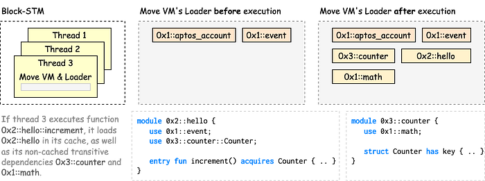 图 1:传统 loader 架构,以及它如何融入 Aptos 区块链使用的 Block-STM 并行执行引擎。每个线程都运行一个带有各自 module cache 的 VM 实例,这些 cache 会随着不同交易的执行而被填充。
