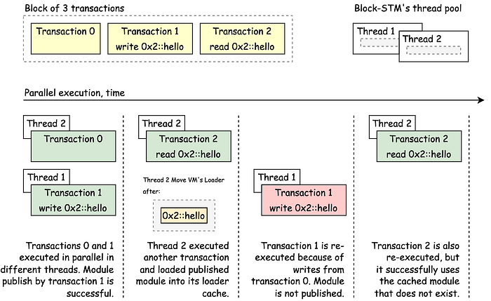 每个 Block-STM 线程都会运行一个 Move virtual machine(VM)实例,用于解释交易指定的 Move bytecode。在执行过程中,Move VM 会通过一个名为 loader 的组件获取存储智能合约代码的 modules。loader 会对 modules 进行反序列化,验证它们及其传递依赖项(例如使用了其他合约时),并将验证后的 modules 缓存在 Move VM 的 cache 中。Modules 也可以被 republished(即智能合约被升级),而 loader 会确保新代码能够被正确使用和链接。