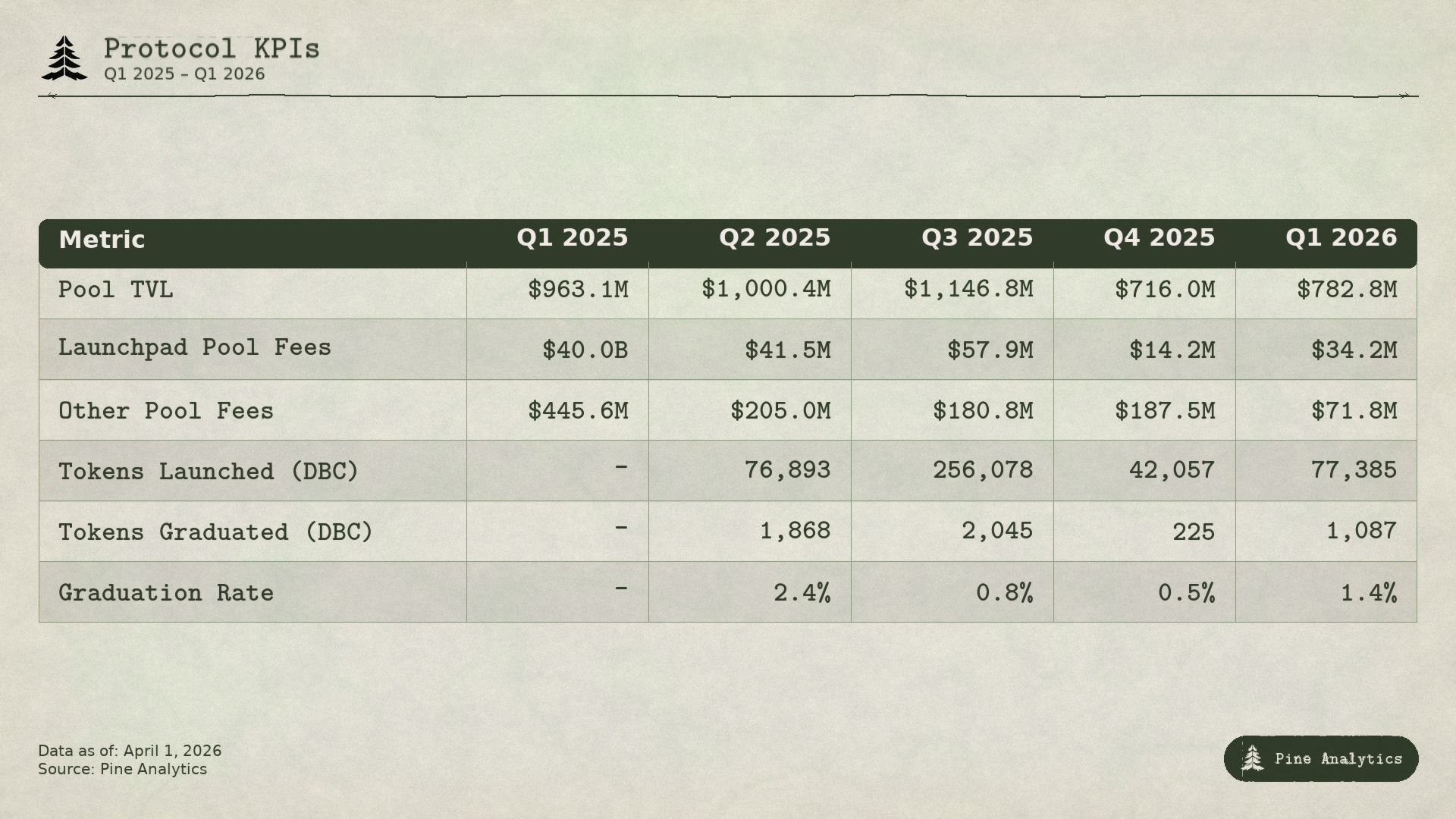在 DBC 活动方面,代币发行量从第四季度的 42,057 个增加到 77,385 个,毕业代币从第四季度的 225 个跳升至 1,087 个。毕业率从第四季度的 0.5% 提高到 1.4%。这一增长是由 1 月份提升合作伙伴收入的同一波 Bags.app 浪潮驱动的,而非发行质量的任何结构性改善。与合作伙伴费用一样,第一季度的月度轨迹可能显示出严重的预加载,随后在 2 月和 3 月大幅消退。