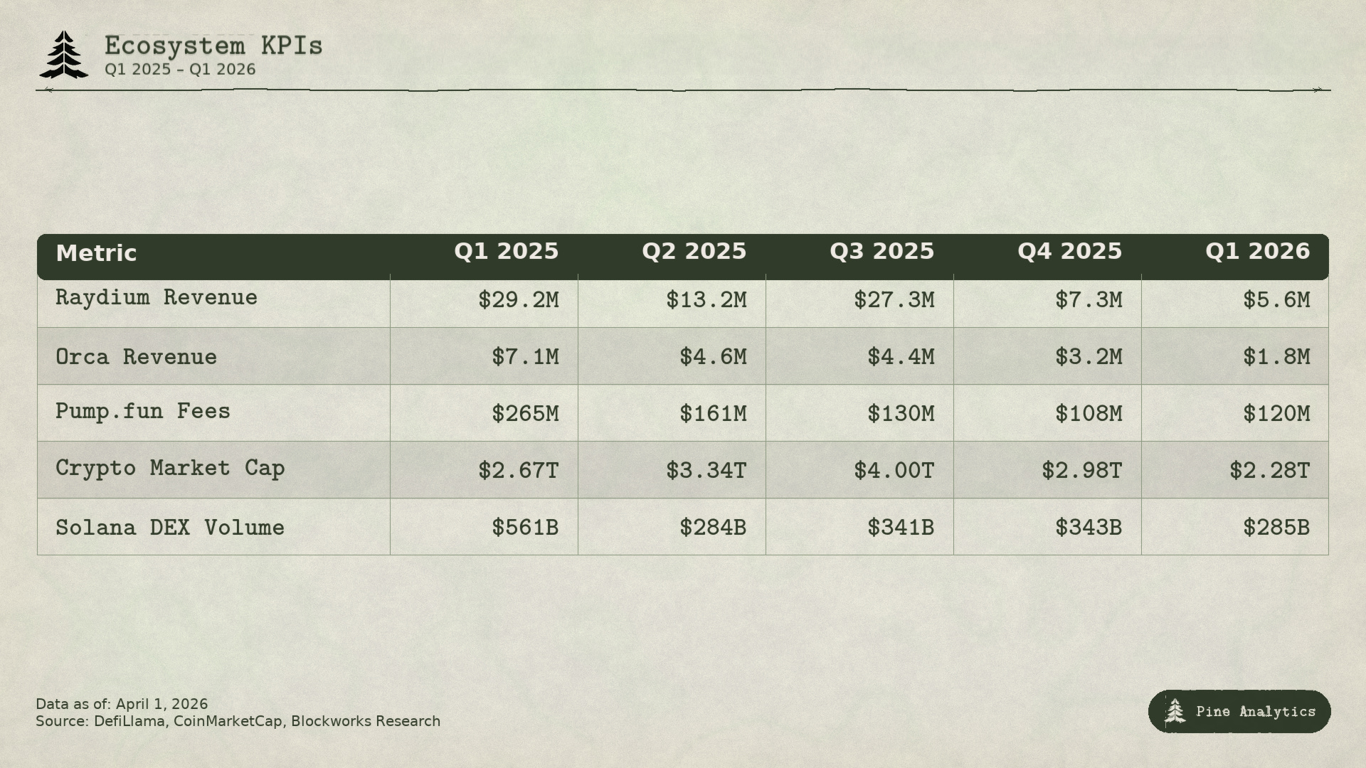 第一季度加密货币市值从 2.98 万亿美元进一步下跌 24% 至 2.28 万亿美元,Solana DEX 交易量下降 17% 至 2845 亿美元。与第四季度 Solana 交易量在市场下跌中持平不同,本季度链上活动随整体估值同步收缩。
