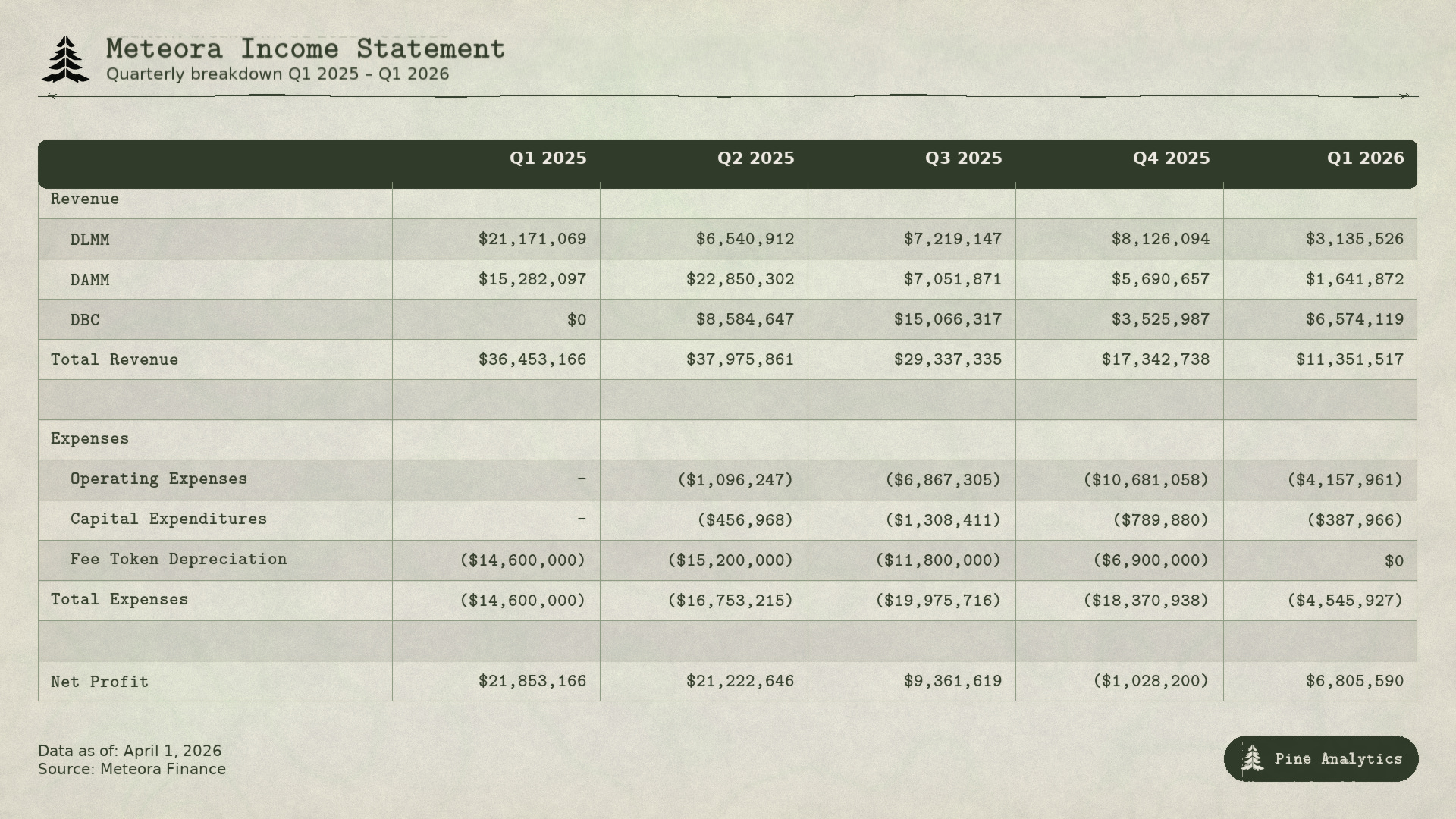 费用代币贬值首次为零。1 月份部署的自动费用转 USDC 机制通过在程序层面将长尾代币费用扫入稳定币,有效地消除了这一项目。在第四季度,估计 690 万美元的贬值支出是损益表上最大的单一拖累。它的移除是自协议开始发布财务数据以来对 Meteora 经济模型最有意义的结构性改进,这也是第一季度尽管收入下降 35% 仍显示 680 万美元利润的一个重要原因。