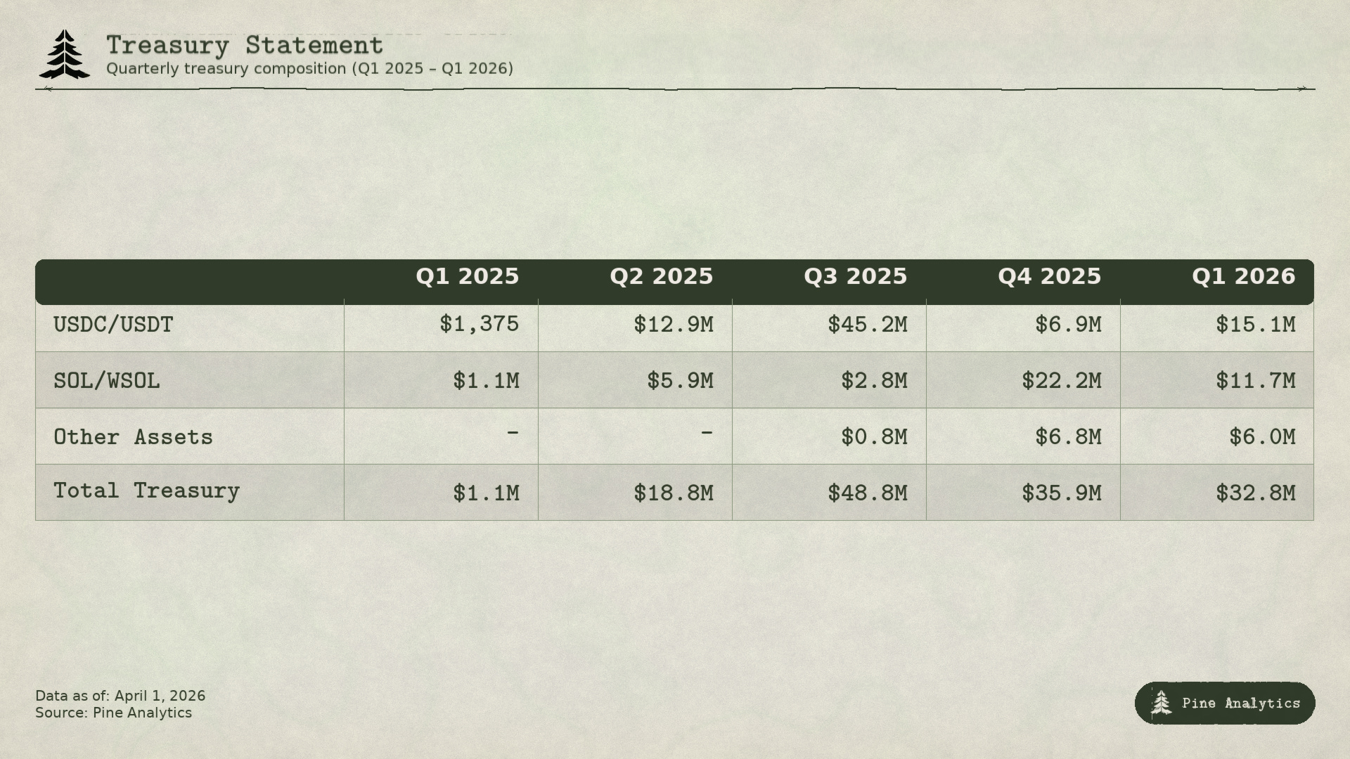 Meteora 在第一季度末的国库资金为 3280 万美元,低于年底的 3590 万美元,尽管该季度产生了 1830 万美元的正向净现金流。这种脱节的原因是资产负债表上非稳定资产价值的下降:国库在整个季度持有大量的非稳定头寸,随着价格下跌,即使有新现金流入,这些持仓的市值(mark-to-market)也出现了下降。国库构成向稳定币转移,USDC/USDT 从 690 万美元翻倍至 1510 万美元,而 SOL/WSOL 从 2220 万美元降至 1170 万美元。另有 600 万美元存放在其他代币持仓中。对于一个以美元计价资助运营的协议来说,这种向稳定币的重新平衡是审慎的国库管理。