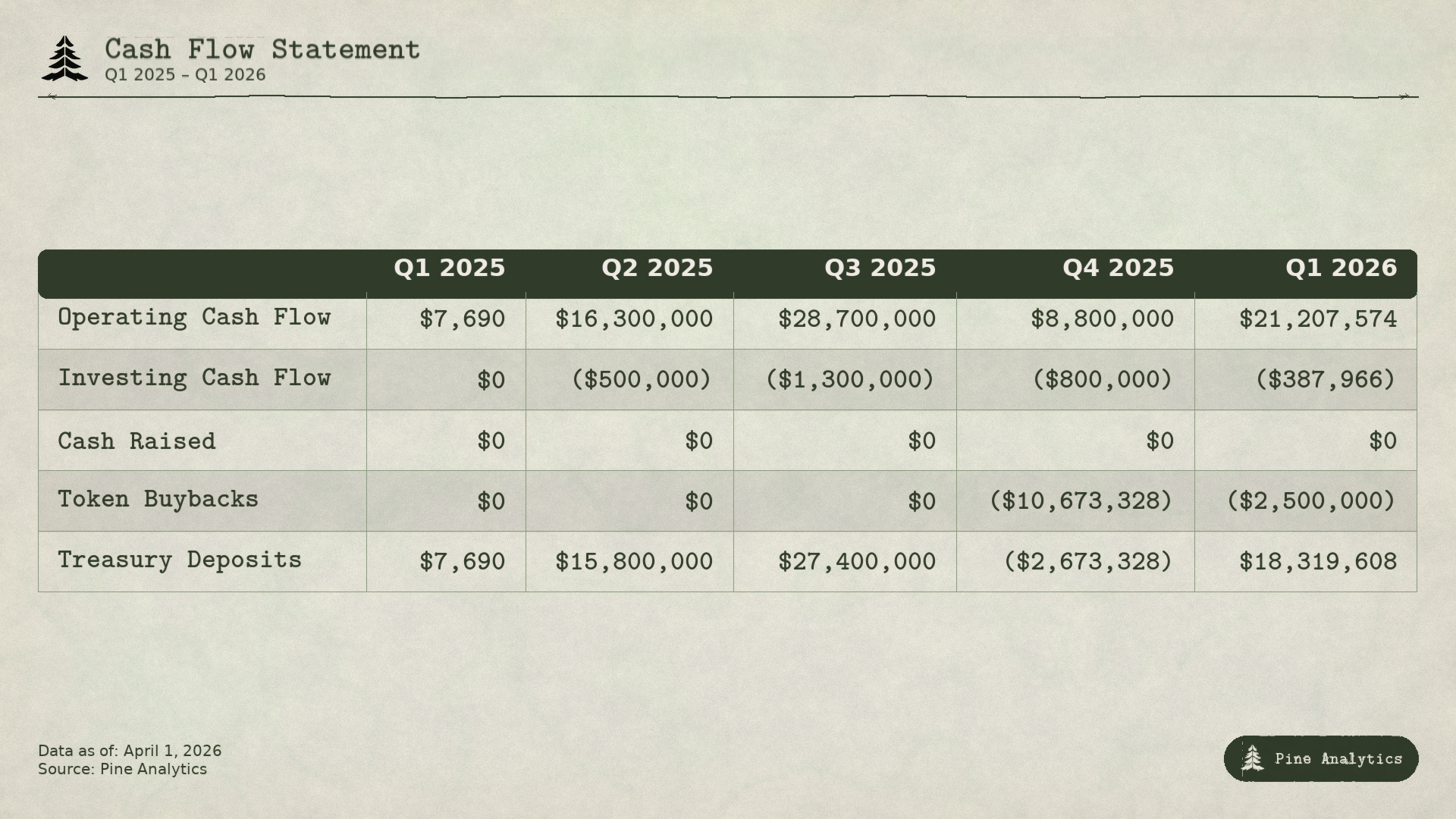 资本支出极少,为 38.8 万美元。结合 420 万美元的运营支出,700 万美元的总流出仅为第四季度 3080 万美元(受非经常性 TGE 成本影响而虚高)的一小部分。现金净变化为 +1830 万美元,较第四季度的 -1130 万美元流出实现了显著逆转,使季度末国库达到 3280 万美元。