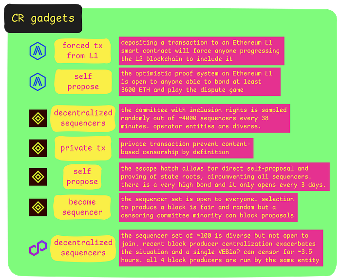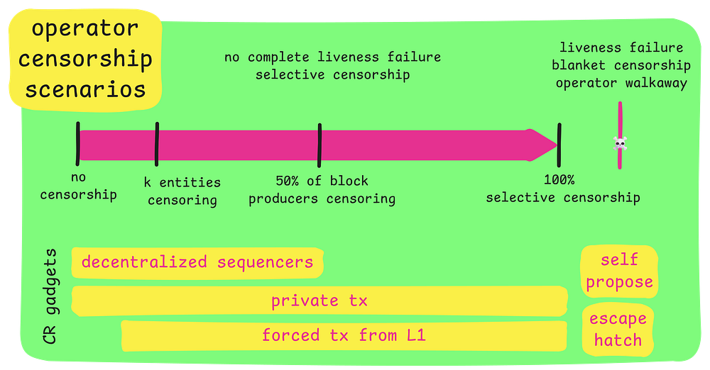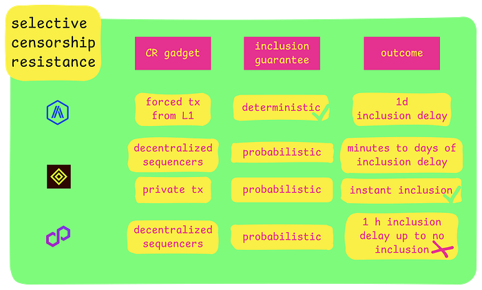 Arbitrum 的中心化 sequencer 可以随意审查,因为用户有一个 forced transaction CR gadget,它保证任何成功并正确地被纳入以太坊的交易都能被纳入。Arbitrum 直接受益于以太坊高 CR(见下文 ‘Where is Ethereum’)。在 L1 交易之后,L2 纳入最多有 1 天的延迟,但纳入是确定性的。OP stack 有一个非常相似的机制。