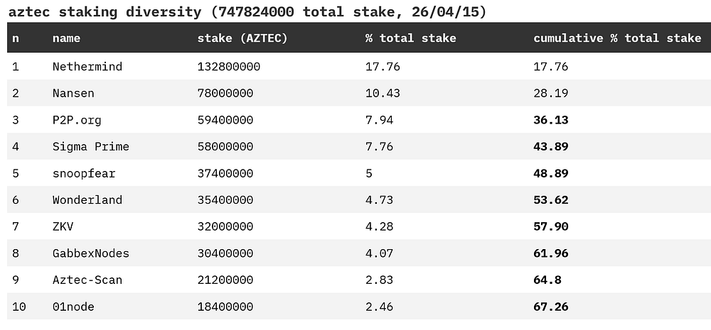 Ethereum 上的 纳入(1) 发生得非常快,因为命中一个不审查你交易的 proposer 的概率很高(没有任何 committee 可以阻止你)。(2) 要求少于 50% 的 validators 审查你,否则你的区块会从 canonical chain 上被 fork 掉。(3) 要求少于 33% 的 validators 审查你。你可以粗略地将 Ethereum 在审查下的纳入 + forkchoice 规则与 Aztec 进行比较,使用这个模拟器。最后,Ethereum 的 validator 集合高度去中心化(比 Aztec 更甚),尤其是因为最大的 ‘entity’ Lido 本身由一些 entities 组成,而这些 entities 每个都质押了不到总 ETH 供应量的 1%。