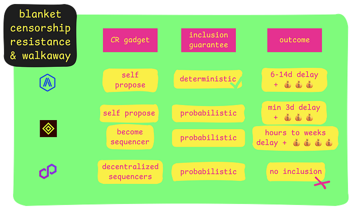 对于像 Arbitrum 这样具有确定性、来源于 Ethereum 的纳入系统来说,单一的 ‘Exit Window’ 很容易计算。对于 Aztec 或 Polygon,这样做并没有太大意义。但即便对于 Arbitrum,要形成一个实用的反审查图景,还需要几个变量。
