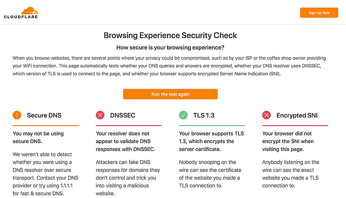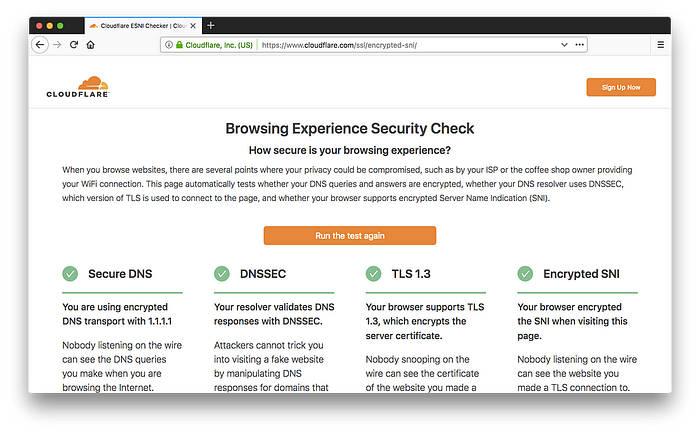 Cloudflare 也在推动保护 DNS 请求,同时推进 DNSSEC 和 TLS 1.3。启用 ESNI 后,它应该显示如下:
