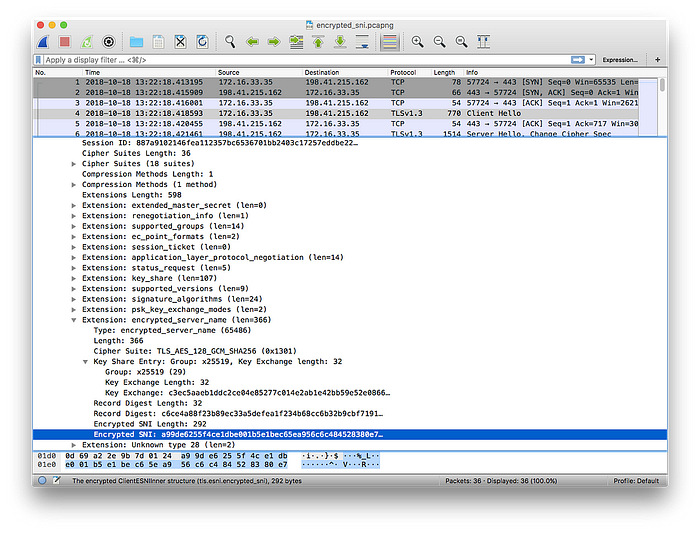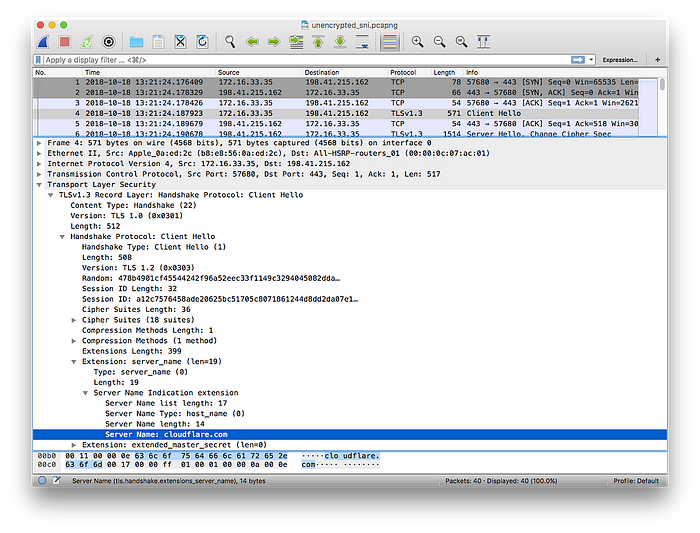 Cloudflare 已发布 Wireshark 抓包来展示其中的差异。下面显示的是普通 TLS,在 TLS 数据包中我们可以看到服务器名称(cloudflare.com):