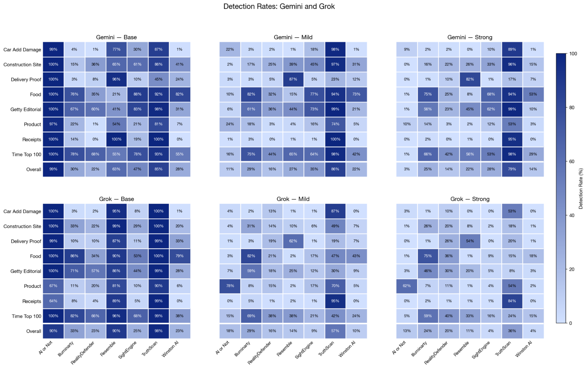 在三种条件下,7 款商业 AI 图像检测器在 8 类图像上的检测率:Base(未修改)、轻微编辑和强编辑。