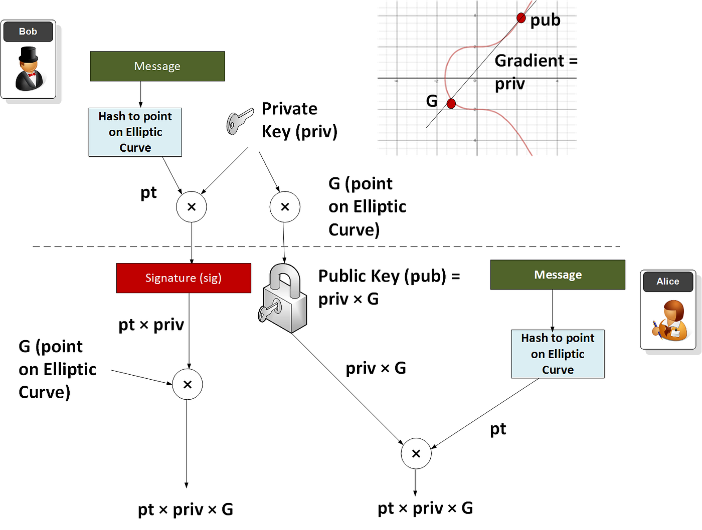 因此,如果我们添加公钥(P1 + P2(mod p)),等效的私钥将是(n + m(mod p))。如果 Bob 有一个私钥(a)和一个公钥(A),然后 Trent 有一个私钥(b)和一个公钥(B)。那么公钥将是 A+B,私钥将是 a+b。以下是一个示例[这里 ]:
