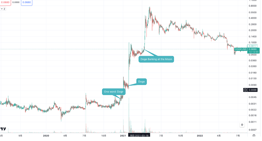 下图高亮显示了埃隆·马斯克为狗狗币成功所做的关键事件和推文。
