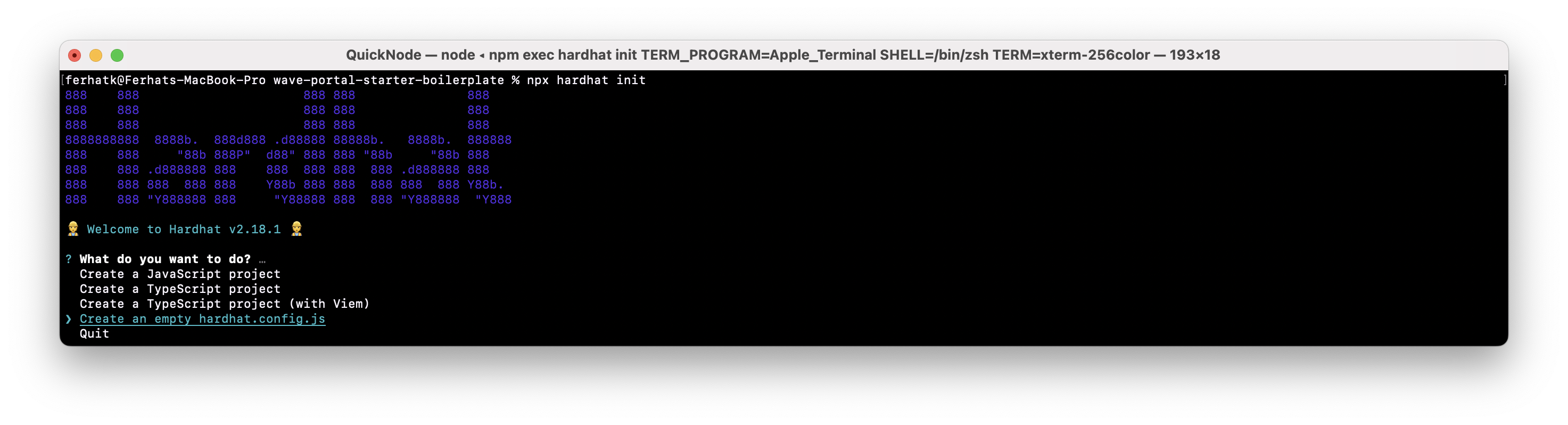 要使用 Hardhat 创建一个新的智能合约开发环境,请运行下面的命令。在终端窗口中运行命令之前,请确保你处于 wave-portal-starter-boilerplate 文件夹。