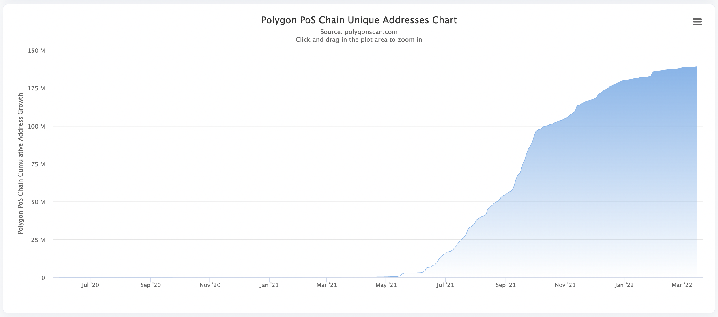 为了解释其增长,Polygon 的锁仓总价值(TVL)在不到一年内从 1 亿增加到超过 30 亿(数据来源)。当查看 Polygon 的独特地址时,我们也可以看到其增长情况: