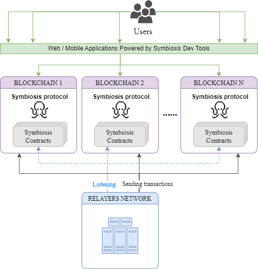 Symbiosis 的架构包括两个主要元素:链上和链下组件。 链上部分由部署在各个链上的智能合约组成,而链下部分由点对点 (P2P) 中继器网络组成。