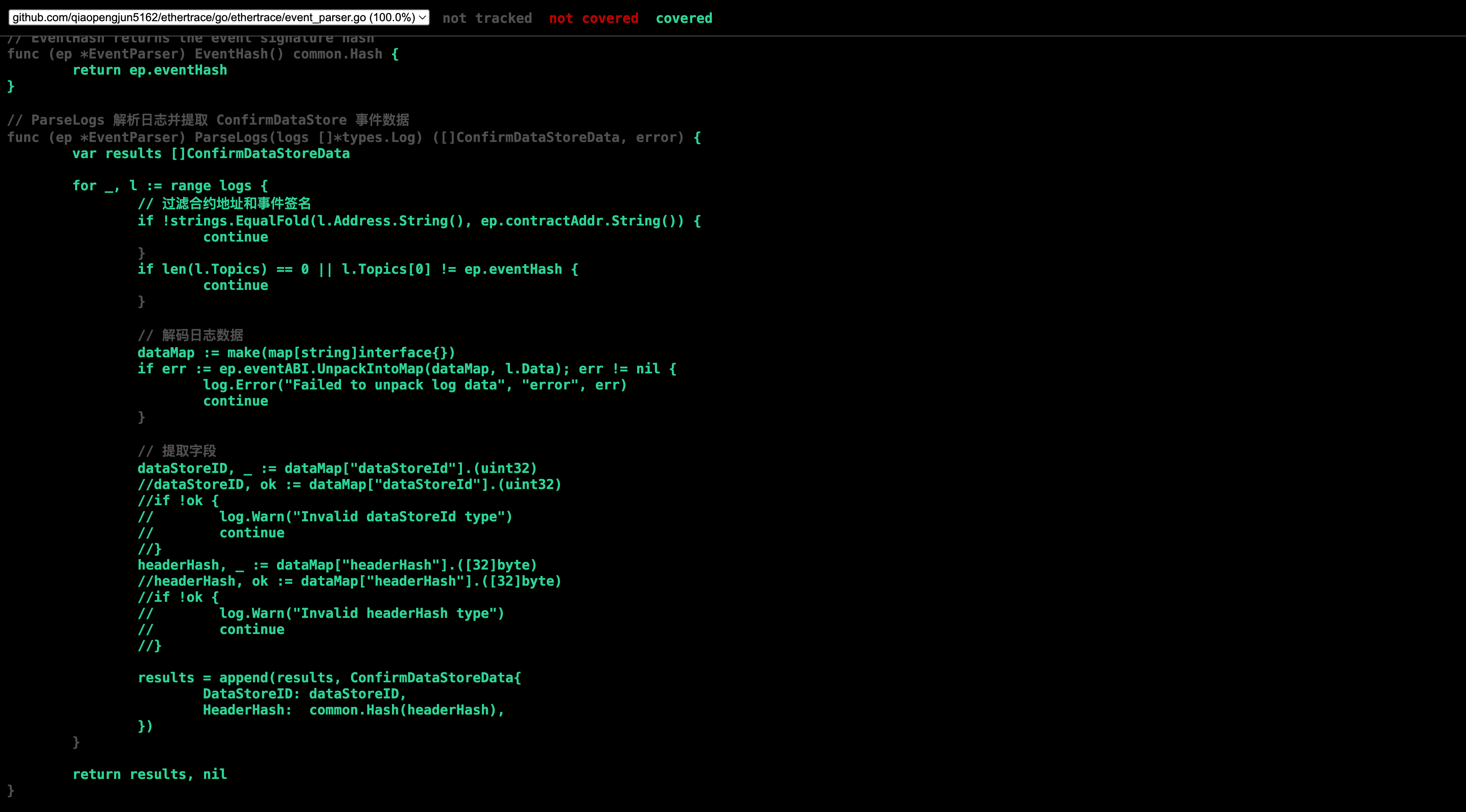 本文通过一个基于 Go 语言的 Web3 数据解析项目(Ethertrace),详细展示如何打造一个以太坊事件解析工具。项目涵盖完整代码实现,包括连接以太坊节点(client.go)、解析 ConfirmDataStore 事件(event_parser.go)以及主程序逻辑(main.go)。通过 ethclient 获取交易收据和区块日志,结合 ABI 解析事件数据,工具高效且易用。项目还包含全面的测试用例(client_test.go 和 event_parser_test.go),实现 100% 测试覆盖率,并通过可视化报告验证代码质量。本文适合对 Web3 开发、以太坊数据提取或 Go 语言感兴趣的读者,提供了可复用的代码框架和实战经验。