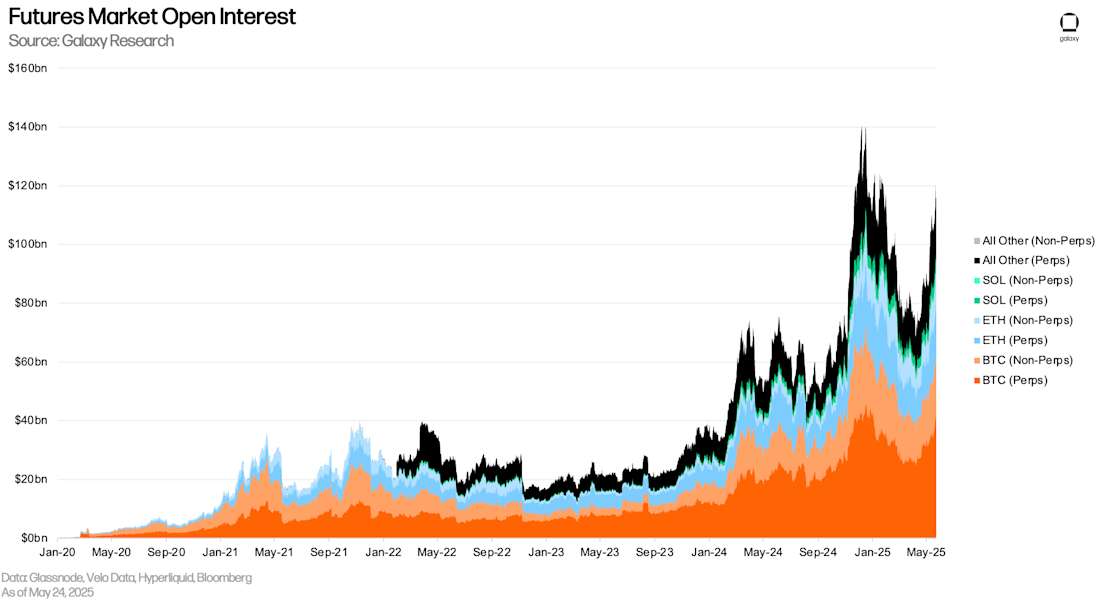在2025年第一季度末,Galaxy Research 发布了一份关于加密借贷状态的综合报告,分析了通过中心化(CeFi)和去中心化金融(DeFi)场所进行的加密抵押借贷的动荡历史和近期趋势。虽然该报告罕见地揭示了加密经济的这一领域,但它并未全面描绘系统中积累的杠杆数量。加密抵押借贷是 2020-2021 年牛市周期中广泛使用的杠杆来源,并最终被证明是断裂并导致市场暴跌的薄弱环节。然而,自那时以来,新的杠杆来源已经出现(例如,比特币国库公司),其他常用的杠杆来源,如期货合约,与之前周期达到的高点相比,出现了大幅增长。