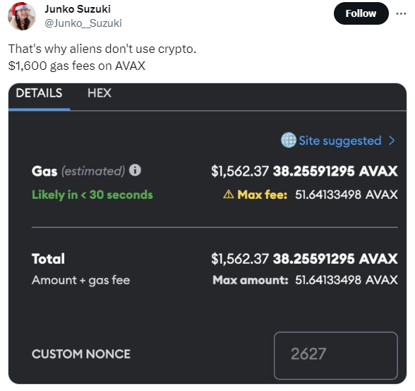 在充满希望的年末,当每个人都热切期待 BTC 现货 ETF 的批准时,各种 EVM 网络因铭文而经历了巨大的困难。12 月 15 日,Arbitrum 网络无法承受大量的铭文交易,导致其定序器停止了 1.5 小时,无法处理用户的交易。Avalanche 网络的交易费用飙升至超过 $1,500,并且从 12 月 13 日到 12 月 25 日,超过 $38.7M 的 gas 被用于与铭文相关的交易中,导致网络拥塞。