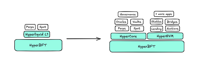此时,Hyperliquid 还澄清了命名。用于永续合约和现货的 L1 执行引擎现在被称为 HyperCore。新的智能合约环境是 HyperEVM。两者都在同一个区块链上运行,具有相同的验证器、共识和状态。区别在于目的:HyperCore 用于交易,HyperEVM 用于智能合约。