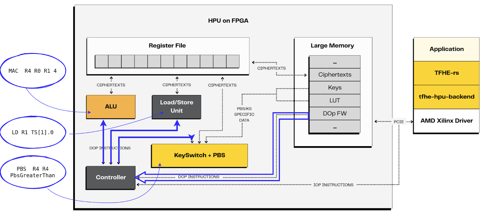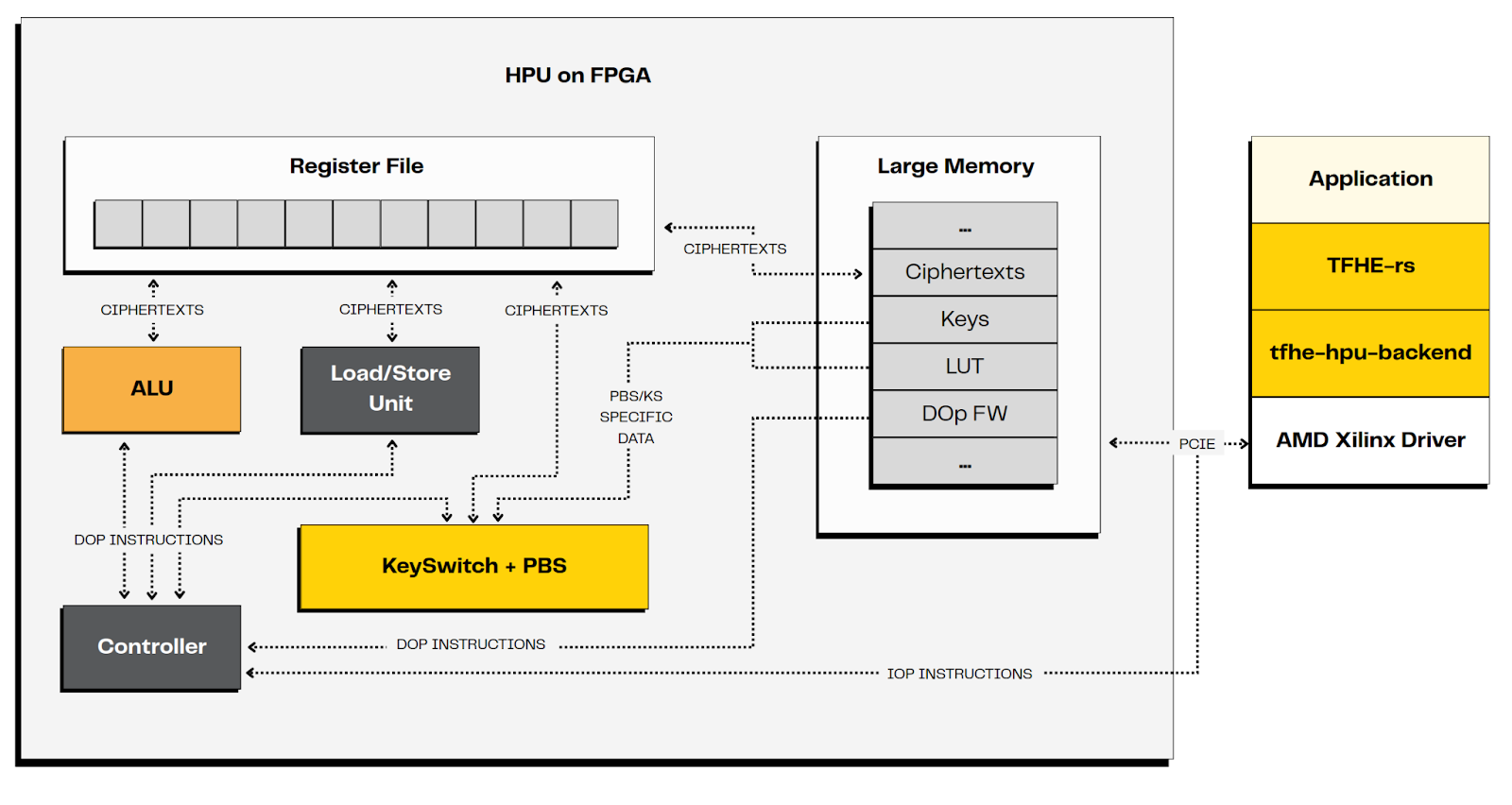 乍一看,HPU 看起来像一个简单的 CPU:它加载指令,处理数据并产生结果。区别在于它计算的内容:HPU 处理的是 FHE 密文,而不是普通的 16 位、32 位或 64 位整数。