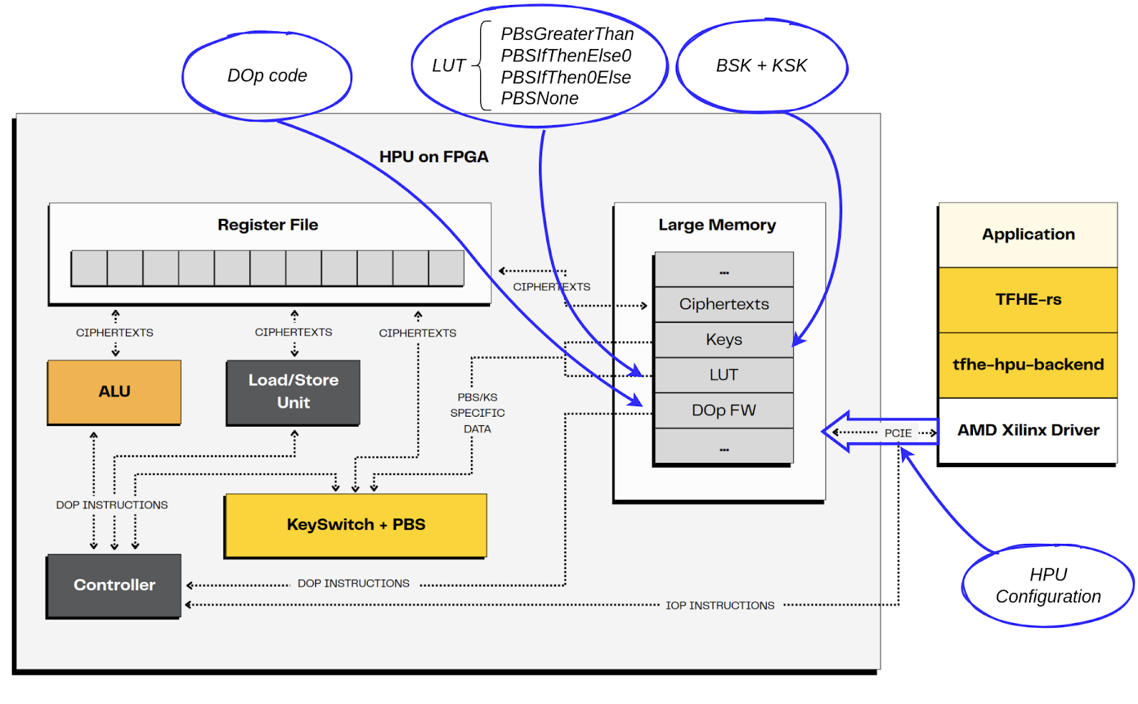 HPU 直接在硬件中实现了 KS 和 PBS。这使得可以在 TFHE 密文上执行无限数量的计算。事实上,可用的 DOp 指令之一正是 KS + PBS。