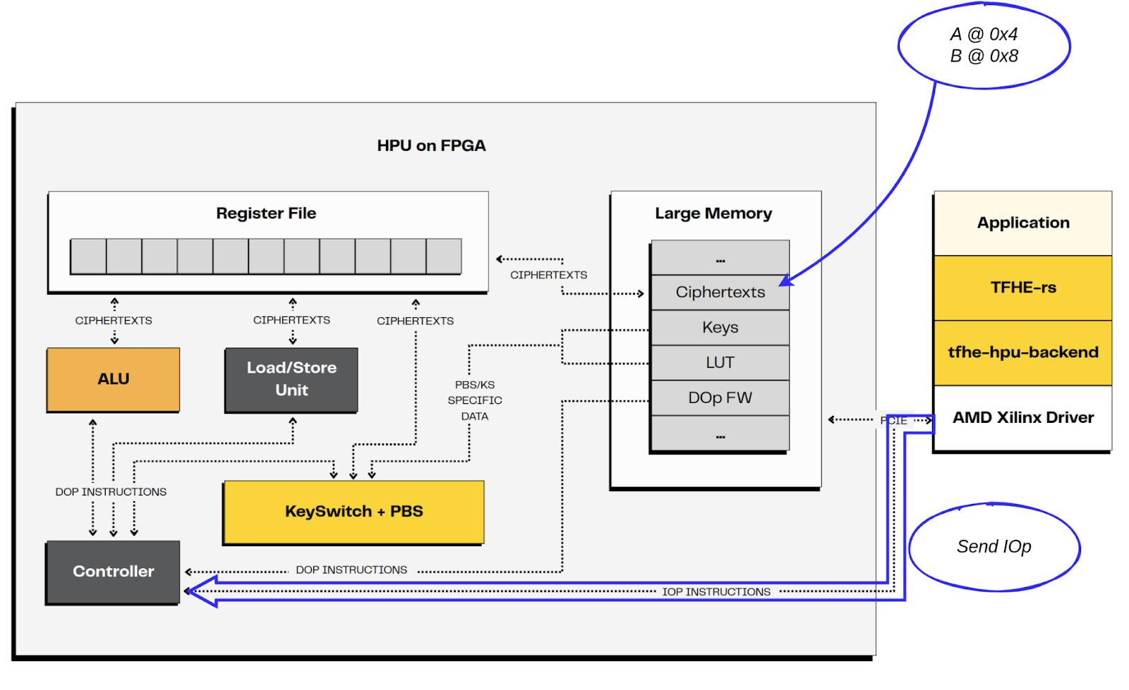 使用 HPU 的第一步是定义你想要的 IOp,并在必要时提供其 DOp 实现。完成之后,HPU 会负责执行 —— 包括噪声管理、LUT 应用和并行分发。