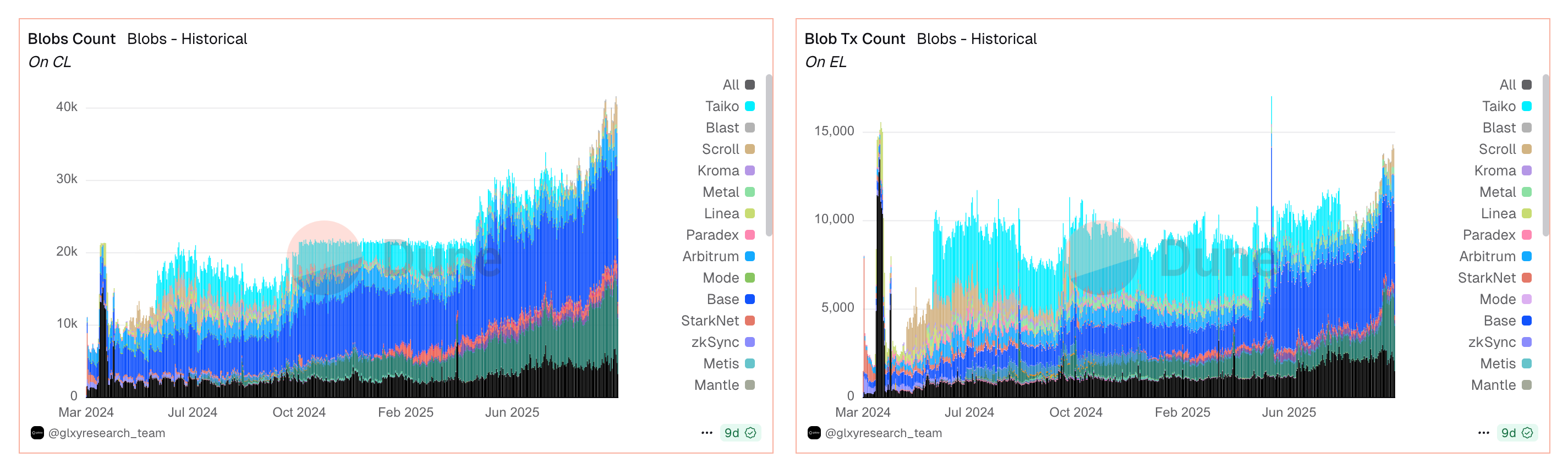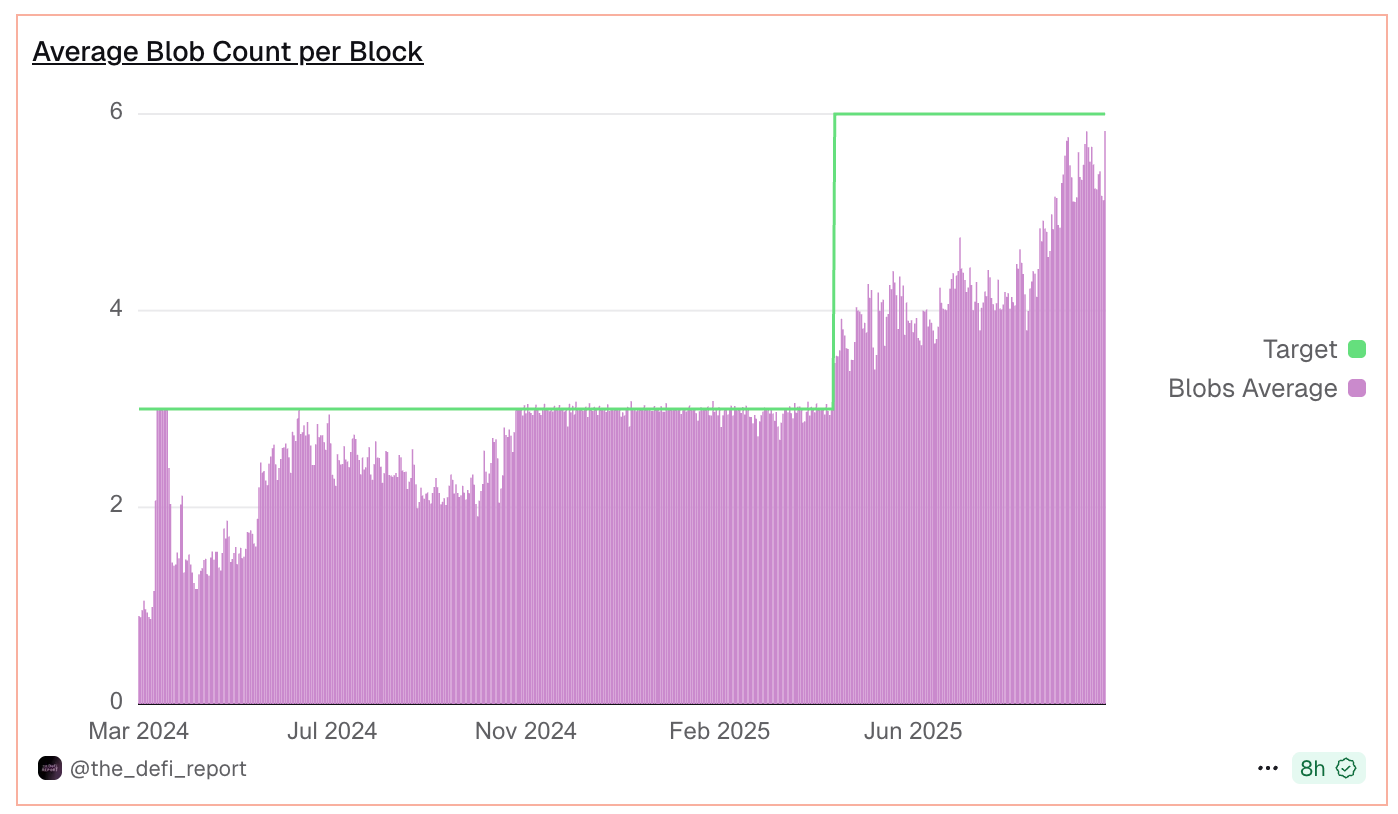 随后在 2025 年 5 月出现了 Pectra,它使 blob 容量翻了一番,将目标从每个区块 3 个 blob 增加到 6 个,并将最大值提高到 9 个。