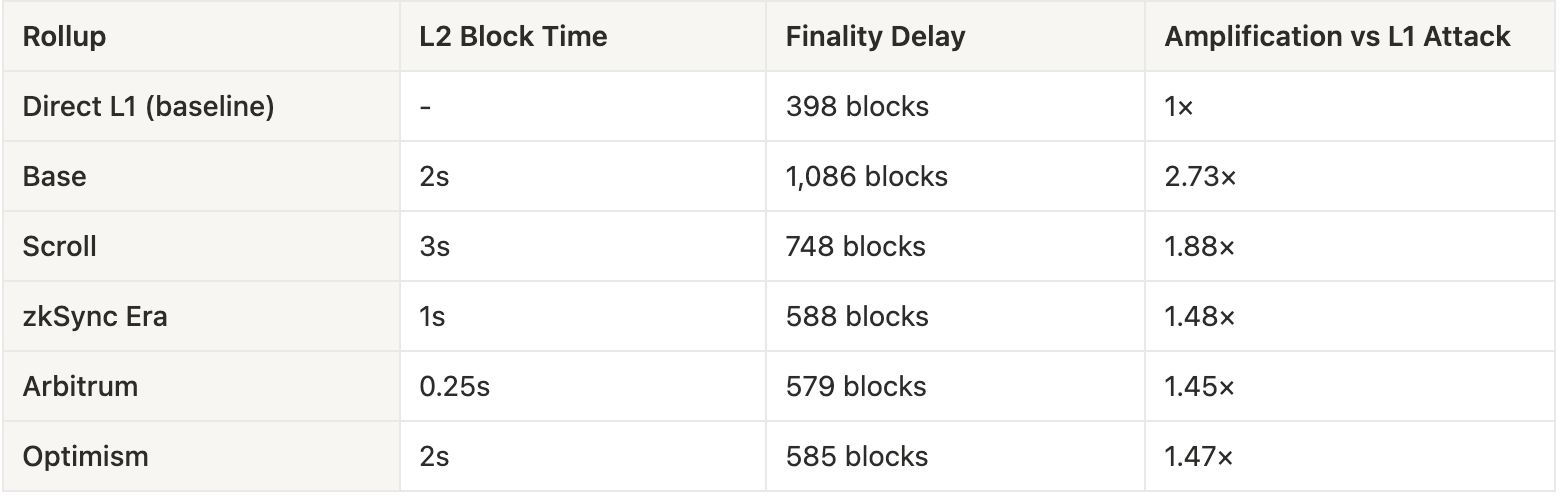 通过用垃圾邮件 Flood L2 而不是直接攻击以太坊,攻击者可以将交易最终确认的时间延迟 1.45 倍–2.73 倍。