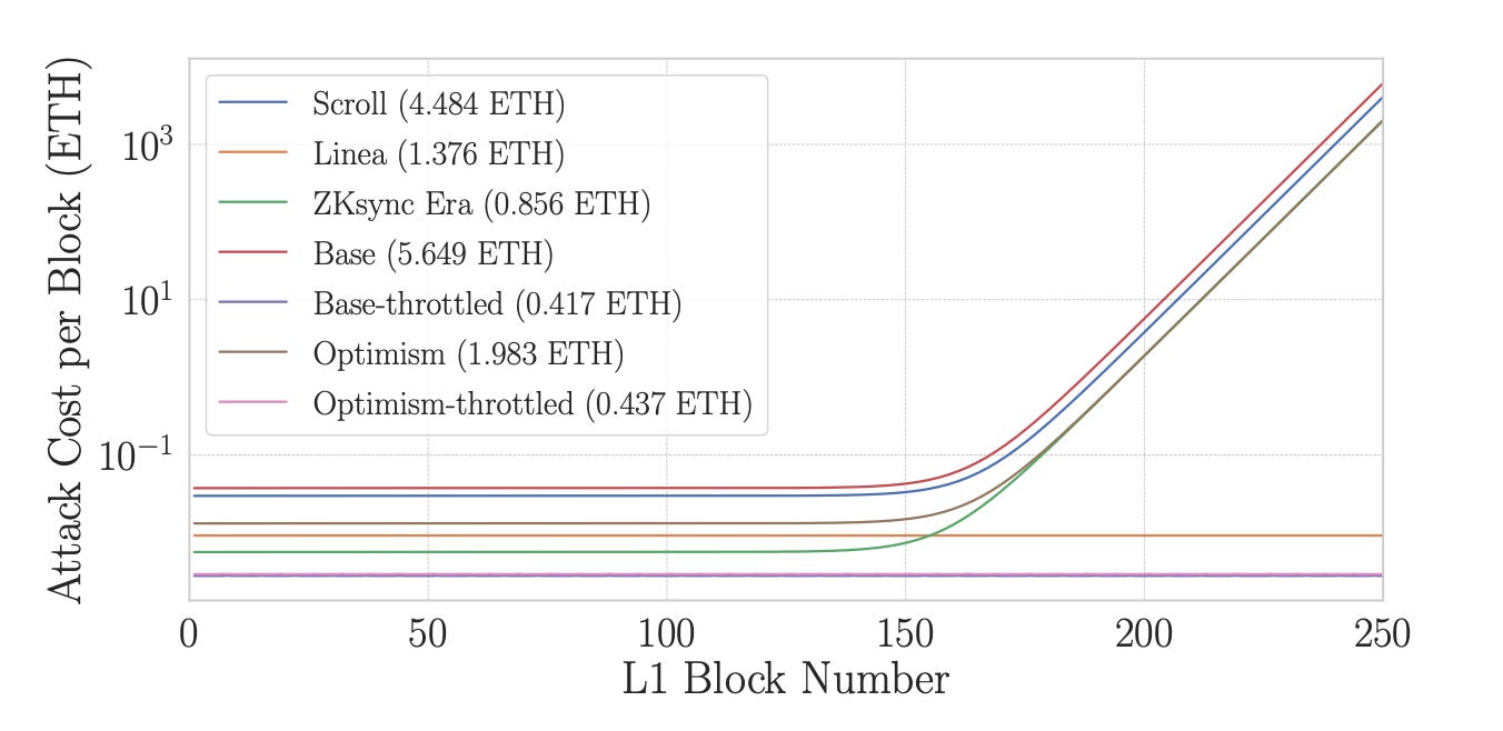 为什么它的破坏性非常大: 当 blob 使用率低于以太坊的目标值时(Pectra 之后很常见),blob 基础费用可能会降至每个字节 1 wei,实际上是免费的。该论文显示,在大多数 rollup 上,30 分钟的周期性 DoS 成本低于 2 ETH。但持续的 DoS 甚至更便宜:Linea 上每小时 0.87 ETH,Optimism 上每小时 0.8 ETH(受到限制),Base 上每小时 2.7 ETH(受到限制),并且可以无限期地DoS。