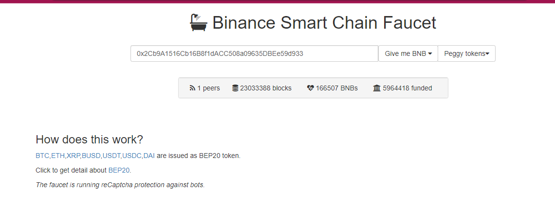 访问 BNB Smart Chain Faucet,粘贴你的 BNB 钱包地址,然后点击“Give Me BNB”以接收 0.5 BNB: