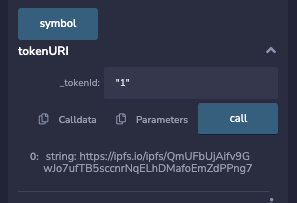 你还可以通过向下滚动到 tokenURI 方法来仔细检查你的元数据是否已正确存储。输入与你在 _tokenId 上面输入的相同值:
