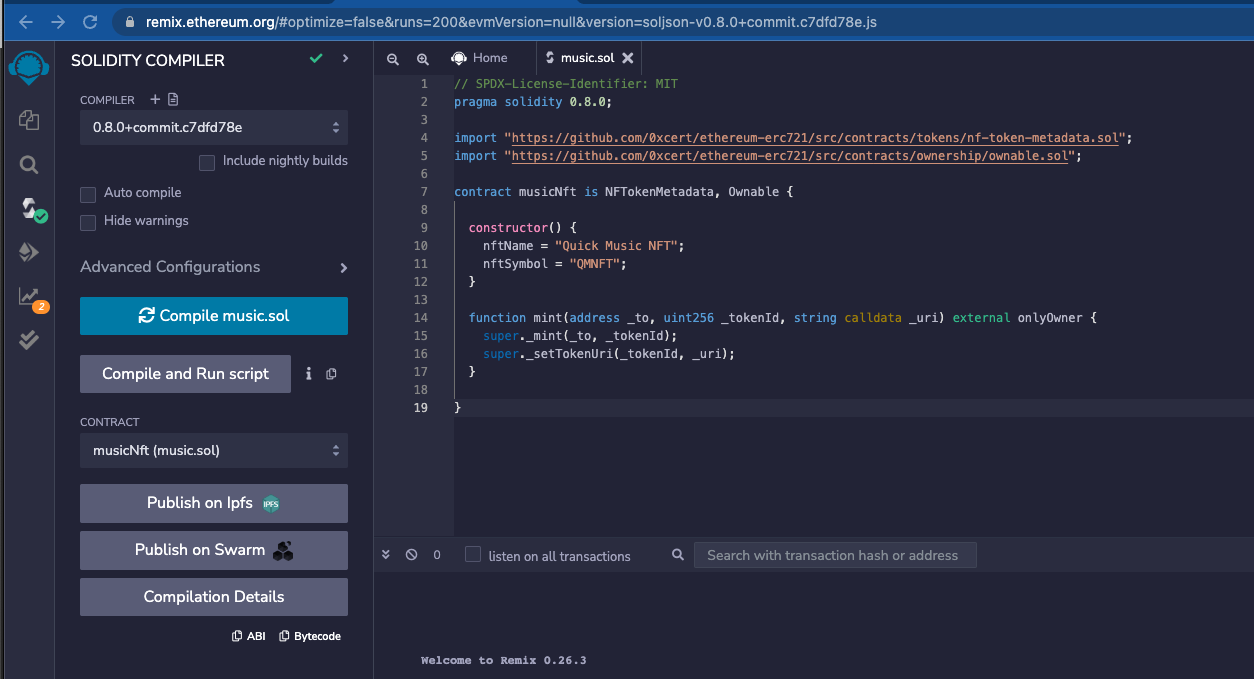 前往 Ethereum Remix IDE 并创建一个新的 Solidity 文件,例如 - music.sol