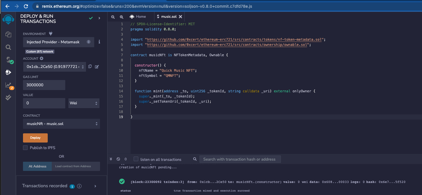 如果在部署之前收到错误消息“此合约可能是抽象的”,这意味着未选择“合约”选项卡下的相应合约。你需要从“合约”下拉列表中选择具有你的歌曲名称的合约名称。然后再次单击 部署