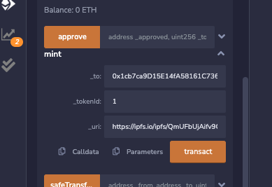 最后,在左侧边栏中滚动到 Remix 中的“已部署合约”部分,然后展开已部署的合约。你将看到一些可以在合约上调用的方法。展开 mint 函数并添加以下详细信息: