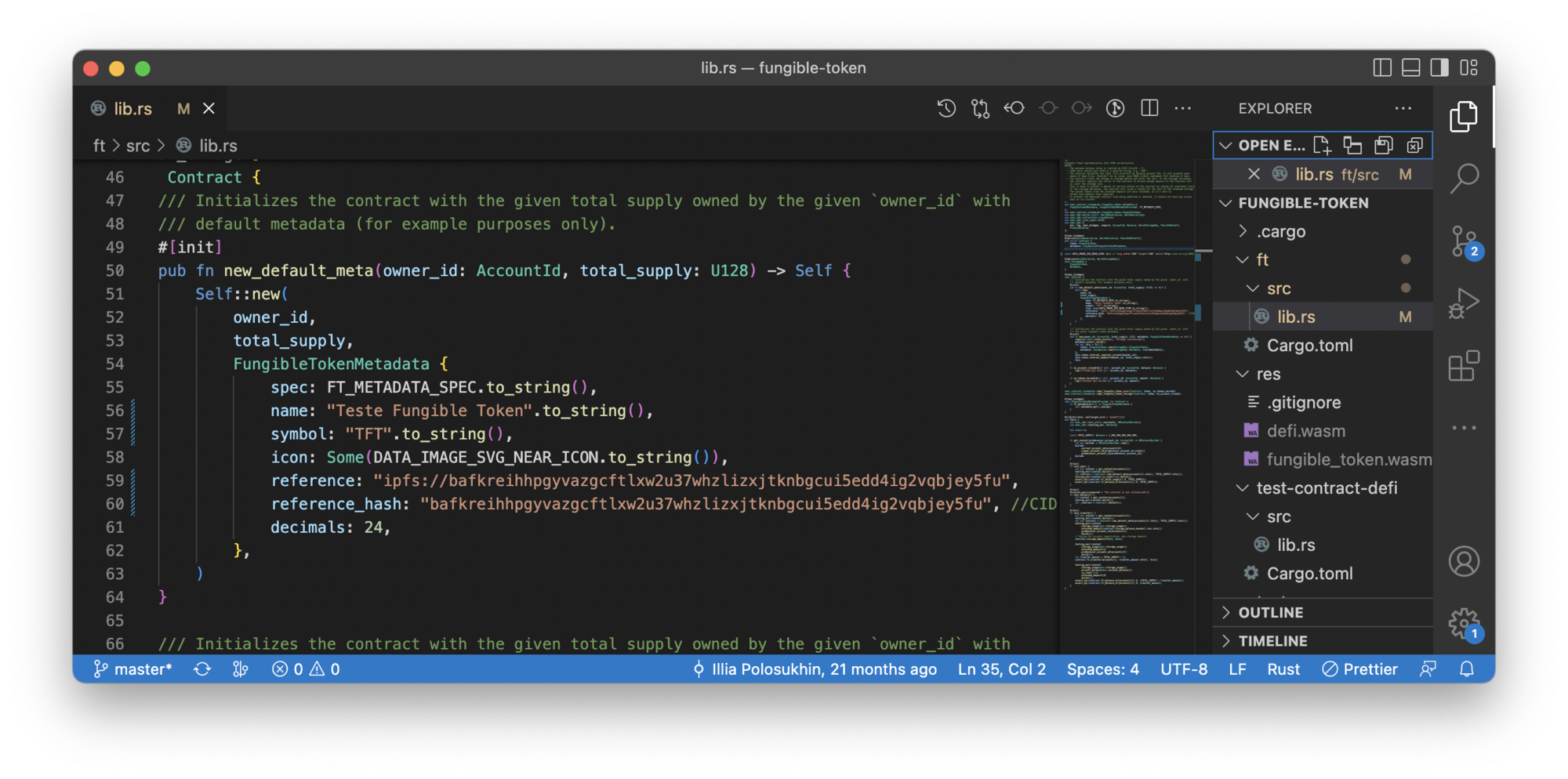 在代码编辑器(例如 VSCode)中打开该目录,然后导航到 examples/fungible-token/ft/src/lib.rs 文件。你可以在此文件中编辑有关你的同质化代币 (Fungible Token) 的详细信息,例如代币 (token) 名称、符号、元数据等。这些详细信息包含在 new_default_meta 函数中。