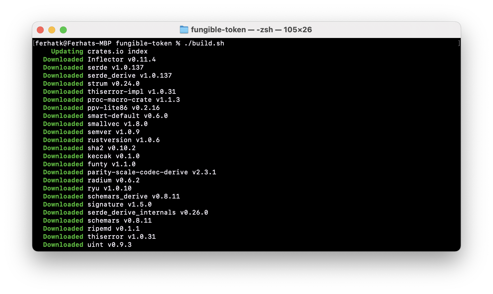 现在我们的同质化代币 (Fungible Token) 详细信息已配置,我们可以编译合约。在 examples/fungible-token 目录中,运行以下命令: